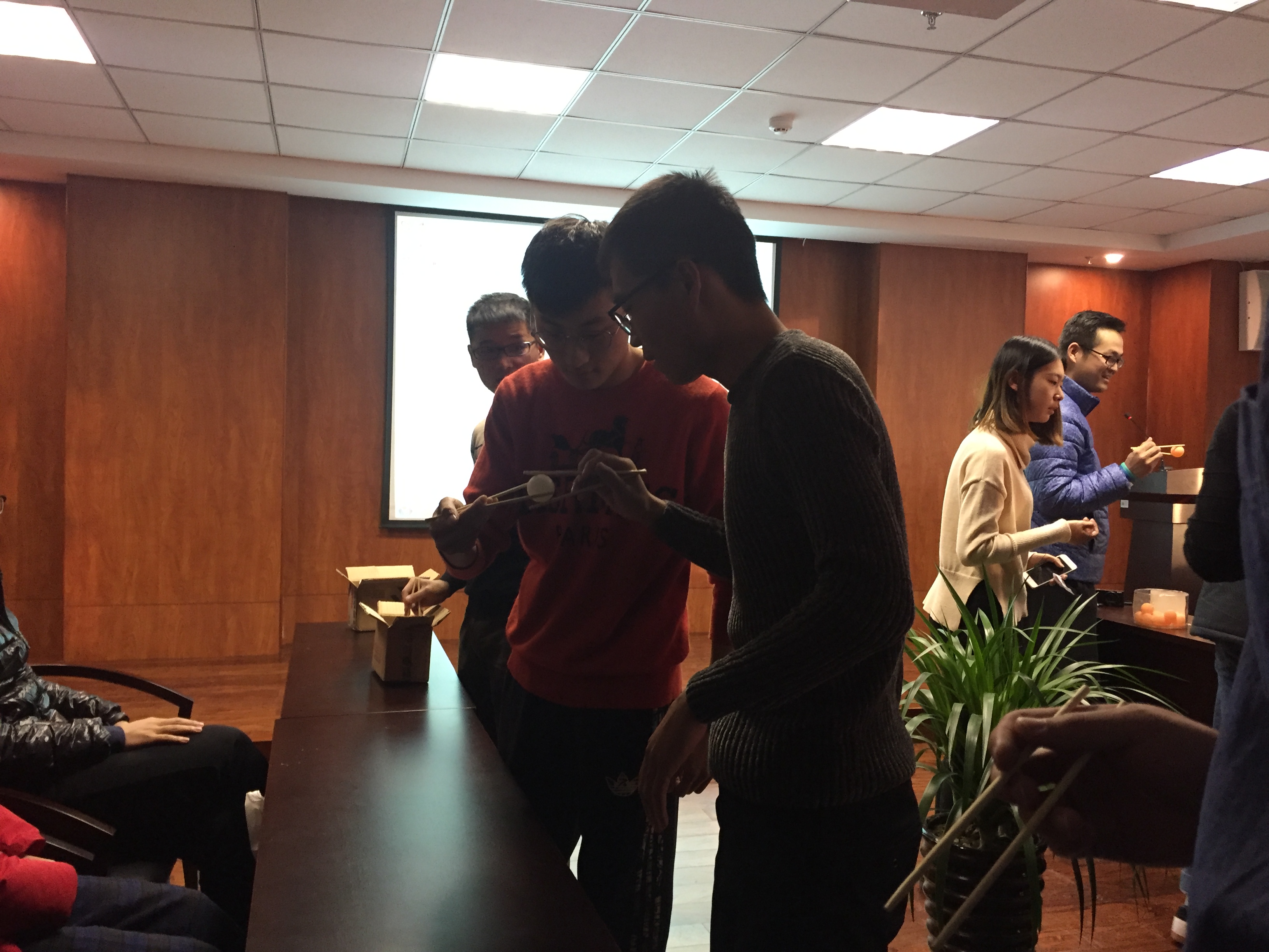 在第三个“互送乒乓球”环节中,同学们按党支部分为8个小组,每个支部派出四人参赛,限时两分钟,使用筷子将乒乓球从第一个人依次传递到最后一个,传递球数最多的组获胜。比赛过程中大家相互团结,齐心协力,都取得了比较好的成绩,也体会到了团结合作的重要性。